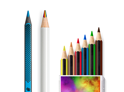 Ein fotorealistischer Digitaldruck auf Buntstiftetuis, Rundumprägung auf Bleistiften,